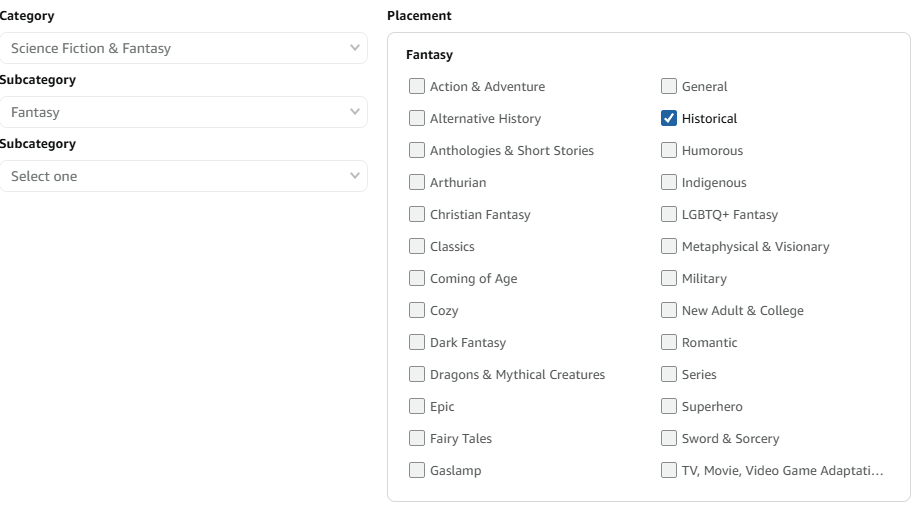 So I got rid of the “dragons” category, and I wanted to select the third category from the science fiction side to get moved out of a fantasy category. I put it into “Alternative History,” because the third book leans into the intersection with history via immigration policy at the time, and any continuation of the story will focus on how dinosaurs might change specific historical events. This got me in trouble with Amazon. I got a nasty letter from Amazon.In (that’s in India) about how my novel didn’t meet their (apparently strict) criteria for “Alternative History,” and it wouldbe removed. I explained my rationale, but they weren’t convinced. They said that I should put it under “portal fantasy,” which made me think that was the perfect genre. Why didn’t I use that? Oh, yeah, because it’s not an option.
